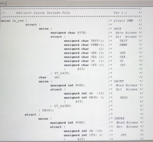Whilst developing for the Renesas H8S using the supplied compiler, issues were found with floating point support and code generation. I successfully built the GNU C compiler, floating point library and utilities for the H8S for the windows platform. I provided patches to the compiler maintainers for H8S features which were accepted. My compiler was available on the internet and was widely used by H8S developers. I created the io.h files by extracting the register and bit definitions from the datasheet, then using a script convert to valid C. Custom start up code to allow system upgrades, and non volatile configuration was written by me in assembler.